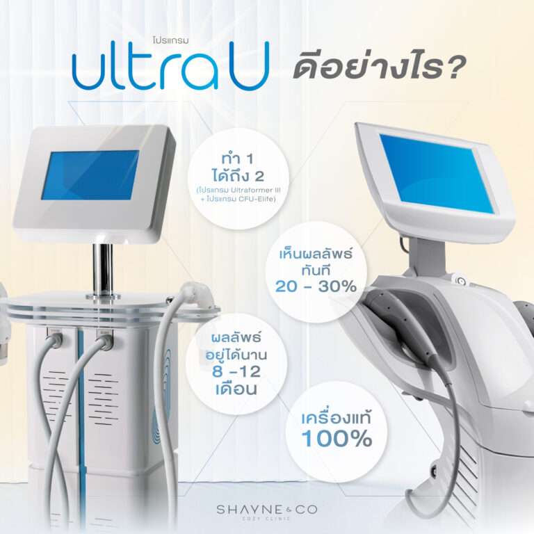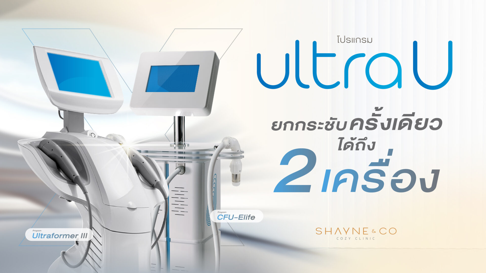โปรแกรม UltraU เป็นโปรแกรมยกกระชับใบหน้า และลำคอที่ทาง Shayne & Co. Clinic ได้นำเครื่อง Ultraformer lll และ เครื่อง CFU มาผสมผสานในการทำการยกกระชับใบหน้าให้มีผลลัพธ์ที่เห็นได้อย่างชัดเจนหลังทำ 20 – 30% และจะเป็นผลลัพธ์อย่างเต็มประสิทธิภาพใน 1 เดือน และทำให้มีผลลัพธ์ที่อยู่ได้นานขึ้นถึง 8 – 12 เดือน
